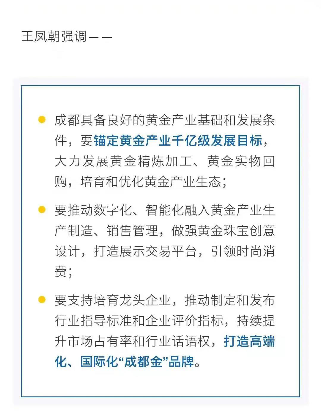 4月14日,市委副书记、市长王凤朝主持召开市政府第129次常务会议,其中会议议项包含审议《成都市支持黄金产业高质量发展的若干政策措施(送审稿)》议题。